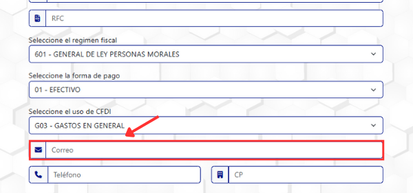 10. Ingresa un "Correo Electrónico" válido; la factura será enviada a dicha dirección.