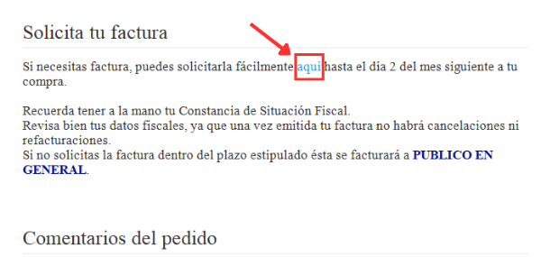 3. Haz clic en el enlace “aquí”, el cual te redirigirá a la página de Solicitud de Factura.
